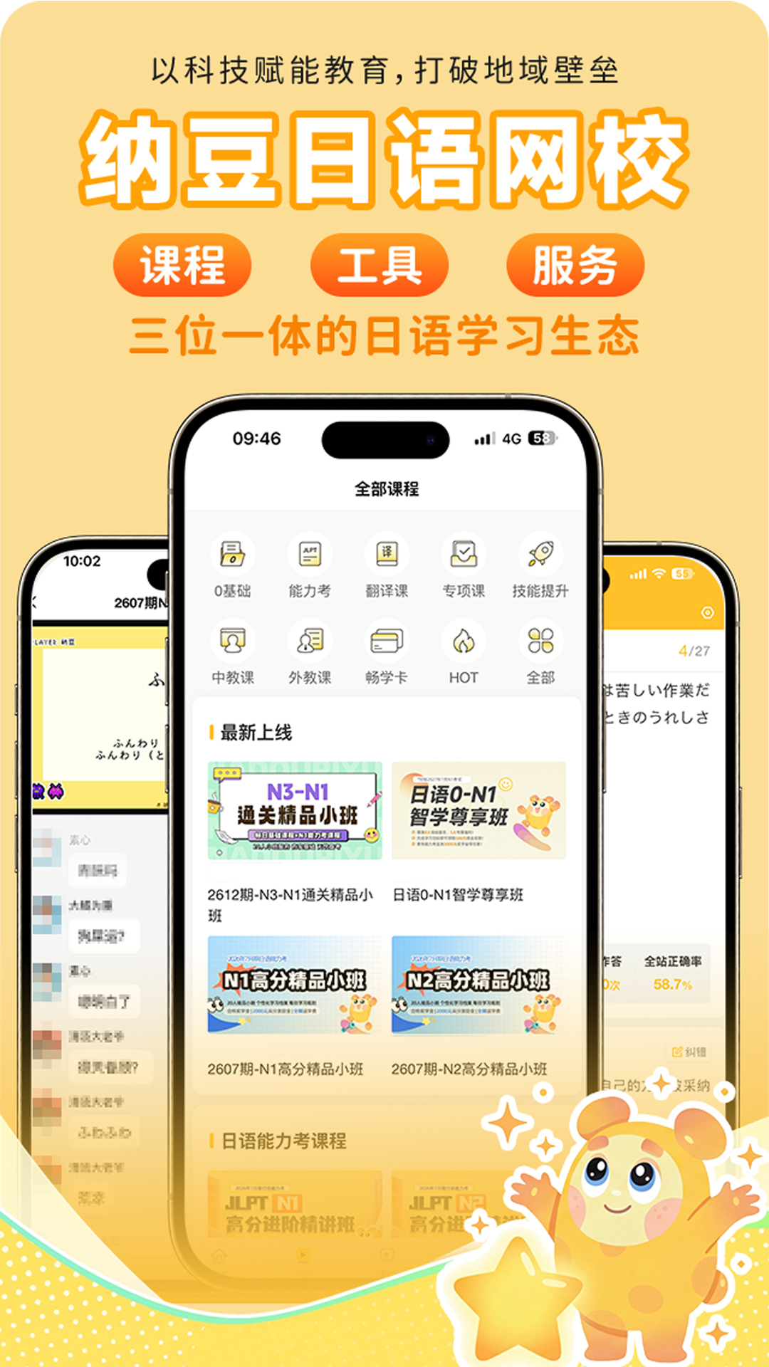 纳豆日语 致力于用技术手段实现教育资源的均衡化。为外语学习者,尤其是日语学习者提供一站式学习解决方案。内有五十音图、日语能力考试、jtest考试、新版标准日本语,大家的日本语等经典教材的直播和录播课程,考试题库等,实现多平台,碎片化学习。