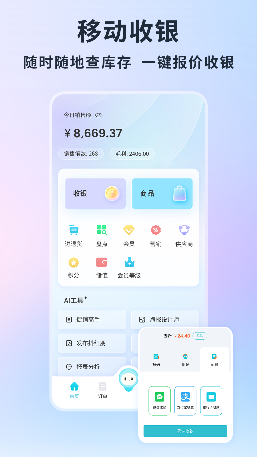 金蝶智慧记AI零售,是专为商超、生鲜、服装、母婴等中小商户打造的新一代智能收银系统,支持记价格,收银,称重,会员维护,活动营销,打价签,记录库存,记账看利润等。界面简洁,操作简单,5分钟轻松上手,支持电脑+手机+PDA,多端多人同时使用,14年软件行业经验,成为30+细分行业、300万批零商户的选择 核心功能: 1、智能收银:扫码自动识别商品及价格,无需提前导入;费率低至0.25%,有效降低结算成本 2、活动营销:基于经营数据一键生成促销方案及宣传素材,自动配文案,一键转发至多营销平台 3、会员管理:支持会员信息增删改查,记录电话生日等,消费充值送积分,系统记录消费明细 4、库存管理:拍照识别进货单,自动录入商品信息,实时监控库存,滞销商品及时预警 5、商品管理:支持多规格(如颜色、尺码)、多单位设置(如箱与瓶换算),并提供条码批量生成与打印 系统已通过ISO27001国际安全认证,数据存储于国内电信级机房,保障信息安全 官网:http://www.zhihuiji.cn 客服热线:400-830-8060 企业QQ:800-821-860 地址:深圳市南山区科技南十二路金蝶软件园