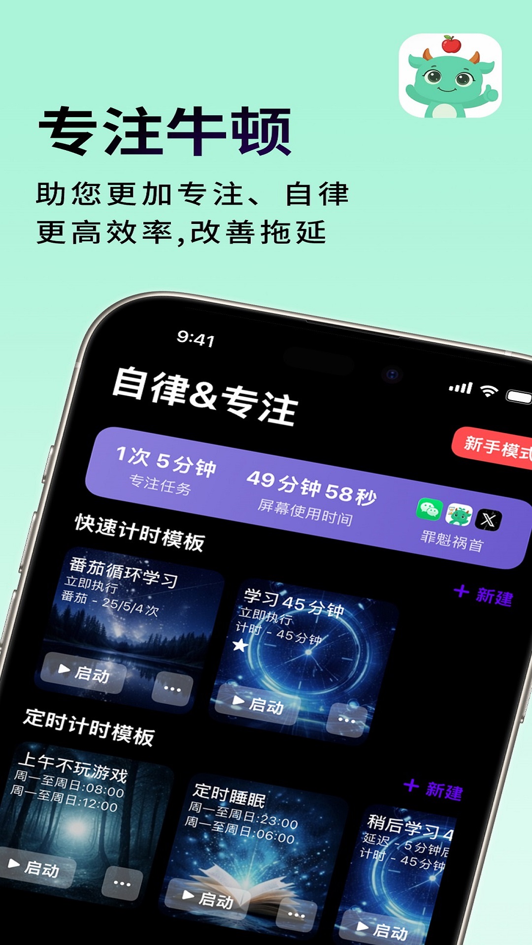 一、为什么需要专注牛顿 你不是不努力,而是被无意识地玩手机消耗了大量时间。 反复解锁、刷短视频、频繁切换应用,这些行为往往并非主动选择。 专注牛顿,帮助你减少无节制、无意识的手机使用,让注意力回到真正重要的事情上。 二、我们的应用带来的益处: 使用首周玩手机的时间减少32% 95% 的用户通过屏蔽应用和网站,每天至少节省2小时的玩手机时间 94% 的严格模式,玩手机的时间减少60% 掌控屏幕时间,屏蔽应用、网站或社交媒体,彻底改变您的数字生活。优先处理任务,提升工作和学习效率,增强您的专注力。 同时,通过「运动打卡 + 解锁奖励」机制,让自律不再只是限制,而是正向激励 —— 用行动换时间,在提升效率的同时,也让身体变得更好。 三、核心功能说明 1、专注任务 自定义专注时长或定时任务 专注期间限制应用使用,减少干扰 提供多种专注强度,适合不同阶段使用 适用于学习、工作、阅读、休息等场景 2、运动打卡 每日记录俯卧撑、深蹲、平板支撑等运动 可自定义每项运动目标数量,完成即打卡 将运动转化为可使用时间,用于临时解锁受限应用 通过运动与使用时间的关联机制,帮助减少无意义使用,同时培养健康习惯 3、一秒干预 打开指定应用时即时提醒 打断下意识操作,防止无意识使用 给自己短暂思考时间,重新做出选择 4、屏幕与应用使用时间限制 设置每日屏幕使用时长上限 限制单个应用或一组应用的使用时间 达到限制后自动锁定,避免继续沉迷 支持定时锁屏或定时禁用 5、使用情况统计 统计屏幕使用时长 统计应用使用时间与次数 记录专注次数与干预次数 帮助用户了解时间分配情况 6、本地优先与数据备份 所有使用数据默认保存在本地 支持手动备份到云端或导出保存 更换设备后可恢复使用记录 四、适用人群 希望控制手机使用时间的用户 学生、备考人群、自我提升人群 容易被短视频和社交应用打断的人 想通过规则而非意志力实现自律的人 希望在专注的同时养成运动习惯的人 五、隐私与数据说明 应用功能主要在设备本地运行 不上传、不分析用户使用行为 仅在会员状态校验或数据备份时使用网络 用户数据始终由用户自行掌控 六、产品理念 自律不是强忍,而是建立清晰的使用规则。 专注牛顿,不只是帮你减少手机使用, 更通过「运动 + 时间奖励」机制,让你在关键时刻停下来, 重新掌控时间、注意力,以及自己的生活节奏。