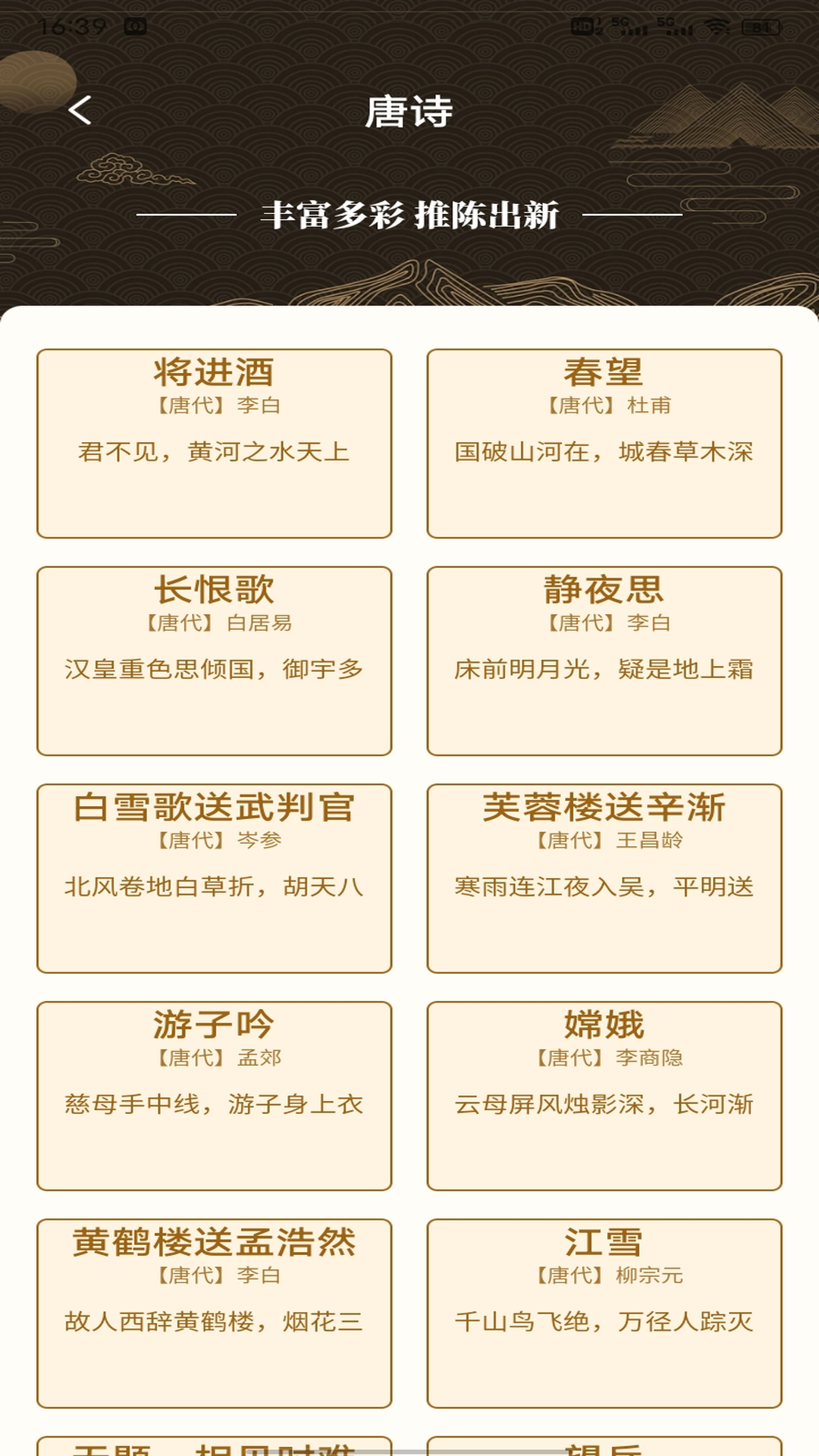 古诗词是真真正正中国文化魅力之大成,滋养着一代代中国人的心灵。 这里是诗词的海洋,诗词是文化源远流长的瑰宝!腹有诗书气自华!我们带你穿梭于诗经楚辞、唐诗宋词的瑰丽世界,让古典之美,在指尖轻轻绽放。