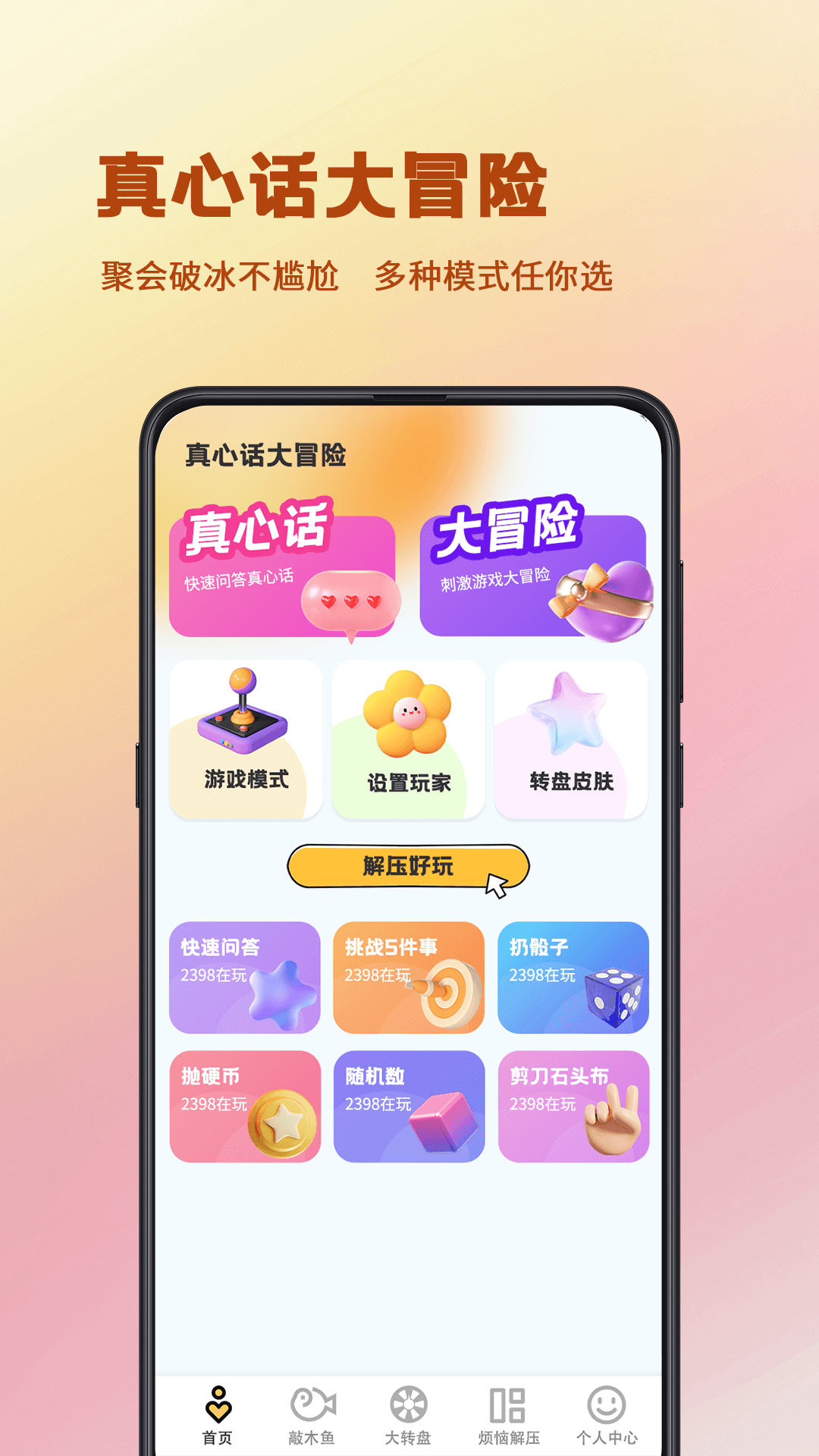 一款专为聚会、派对、家庭活动以及朋友间休闲娱乐设计的全方位互动娱乐应用。 真心话: 在聚会中,真心话环节总是能激发大家的好奇心与分享欲。聚会玩iHappy提供了丰富的真心话题库,涵盖生活、情感、趣事等多个方面,让每个人都能找到感兴趣的话题。 用户可以随机抽取问题,也可以自定义添加问题,让真心话环节更加贴合聚会的氛围和大家的喜好。 大冒险: 大冒险环节则充满了刺激与挑战。聚会玩iHappy同样提供了多种大冒险任务供用户选择,既有简单的肢体动作挑战,也有需要一定勇气和创意的任务。 用户可以根据自己的意愿和聚会的实际情况,选择或调整任务难度,确保每个人都能在安全、愉快的氛围中参与。 敲木鱼: 敲木鱼是一款轻松解压的小游戏,特别适合在聚会间隙或等待时间中放松身心。 用户只需轻点屏幕,即可模拟敲击木鱼的声音和动画效果,帮助大家平复心情,享受片刻宁静。 大转盘选择: 大转盘选择是聚会玩iHappy中的另一大亮点。它适用于各种需要随机选择的场景,如决定游戏顺序、选择惩罚方式等。 用户可以自定义大转盘上的选项,确保每次转动都能带来意想不到的惊喜和乐趣。