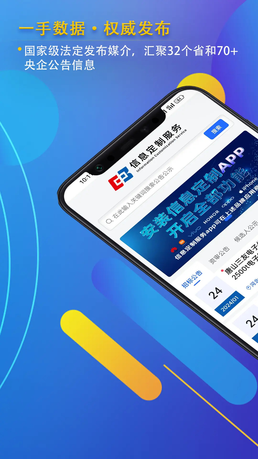 信息定制服务APP是中国招标投标公共服务平台面向广大投标人、潜在投标人以及社会公众开发的一款提供招标公告公示信息便捷查阅和精准订制服务的移动端工具。本服务的特点是依靠中国招标投标公共服务平台作为发布媒介的权威、全量数据优势,以及平台研发的智能标签信息查询系统,能够为广大用户提供招标公告公示数据的精准锁定和实时推送。此外,本服务还凭借巨大的数据量积累,为广大用户提供基于大数据分析和人工智能技术开发的数据衍生产品。