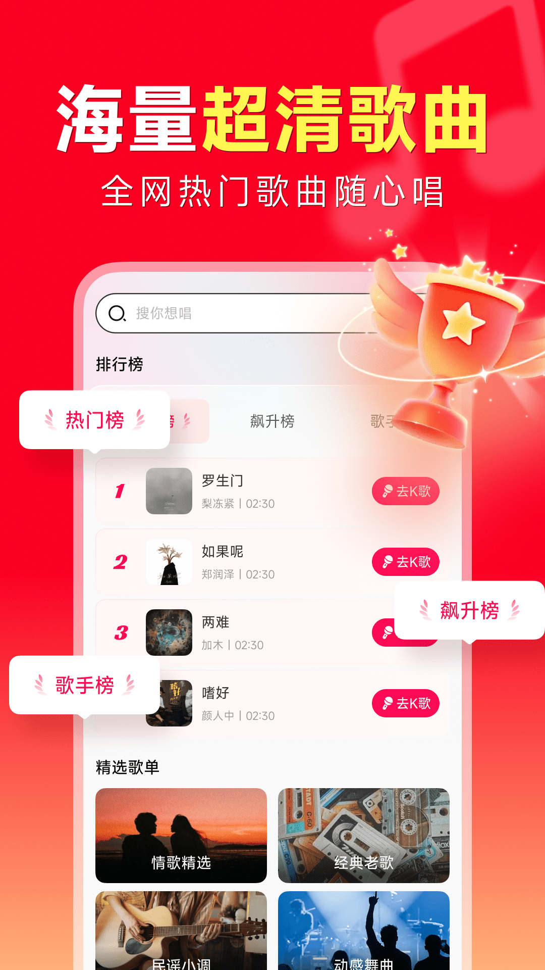 该app是一款为音乐爱好者打造的免费唱歌 APP,集海量超清歌曲、高清录音棚体验、移动点歌台与唱歌技巧教学于一体,让你随时随地畅享 KTV 级唱歌乐趣,轻松释放音乐魅力。 【核心功能】 海量超清歌曲:汇聚全网热门歌曲,涵盖热门榜、飙升榜、歌手榜等各类榜单,还有精选歌单分类,快速找到心动旋律,满足不同风格的唱歌需求。 高清录音棚:提供专业的录唱功能,支持原唱、调音等个性化设置,带来唱 K 体验,让你在家也能拥有录音棚级的录唱效果。 移动点歌台:千万歌曲任你选,支持原唱、伴奏、清唱多种演唱模式,想唱就唱。 唱歌小技巧:涵盖气息训练、高音技巧、共鸣发声、情感表达等专业唱歌知识,助你进阶 K 歌大神,提升演唱水平。 无论你是想紧跟潮流唱热歌,还是想提升唱歌技巧,该app都能满足你。快下载它,开启你的音乐唱歌之旅,尽情展现你的歌唱才华吧!