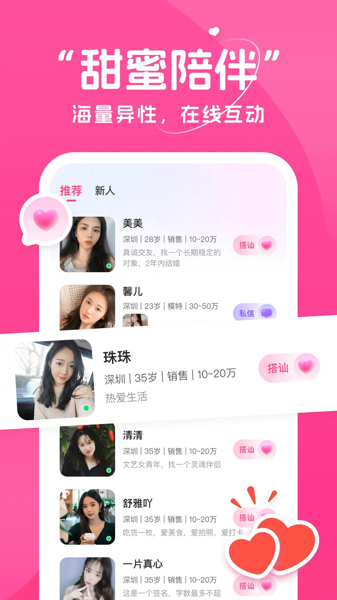 甜语APP是一款真人视频聊天交友约会平台,平台上的真人认证用户均经过严格审查,依托大数据推荐和匹配技术,根据您的兴趣偏好,让你快速在这里找到有趣的人, 感受聊天交友带给你的乐趣。