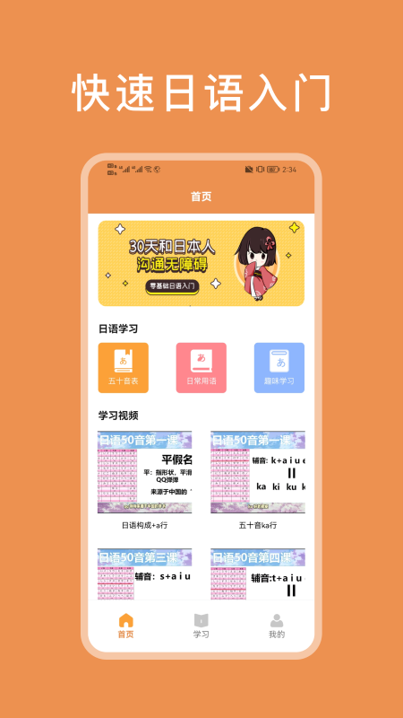 【五十音表】 零基础开始学日语发音,帮助日语初学者轻松入门 【日常用语】 帮助你在日常生活中也能使用日语轻松沟通交流 【趣味学习】 寓教于乐,让日语学习不再枯燥