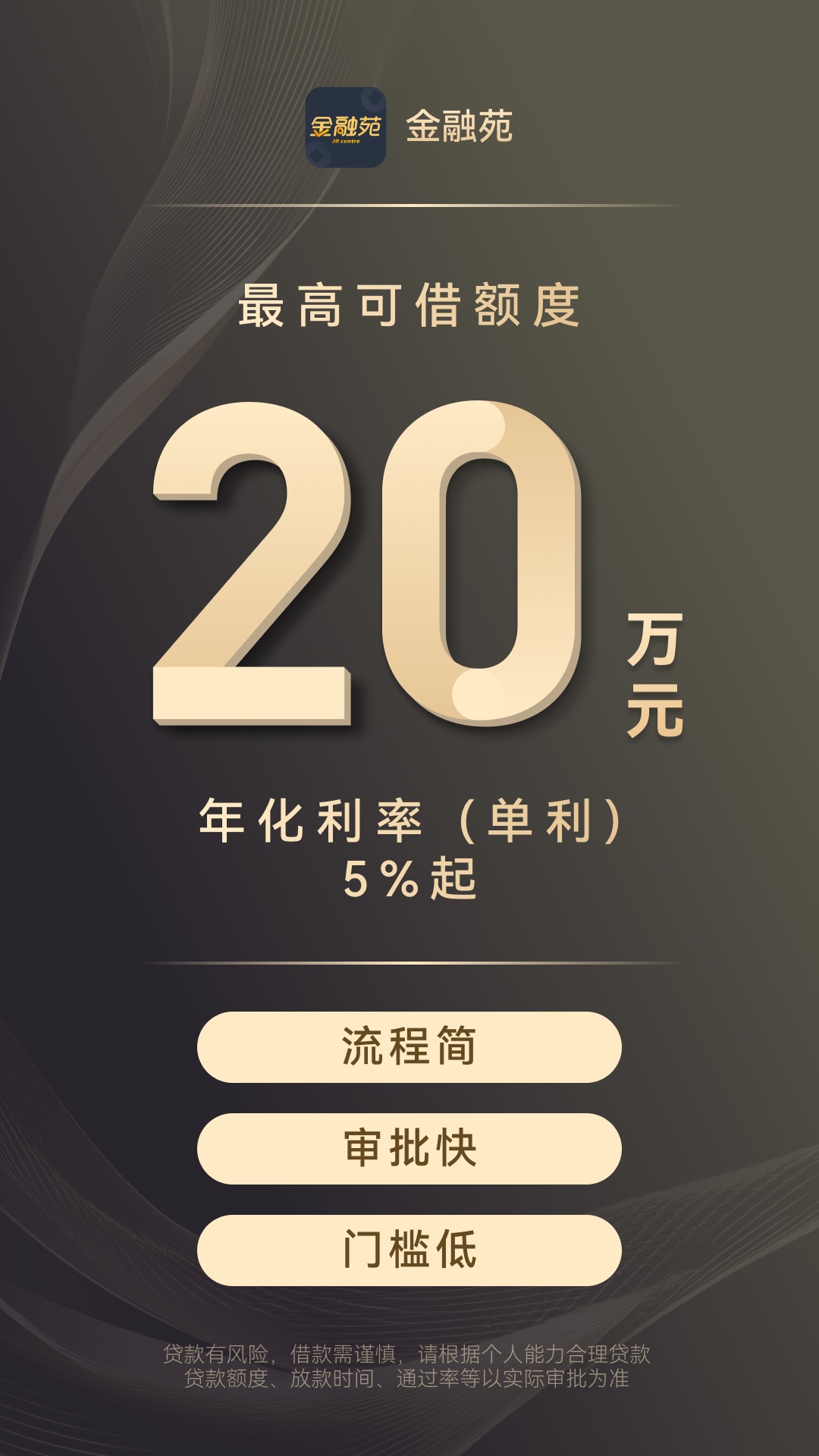 【额度高】100元—20万额度,专业线上借钱平台 【放款快】1分钟申请,2分钟审批!资料简单,轻松拿钱 【分期长】可借长达12期,分期灵活 【操作易】借款进度随时查,多种还款方式任你选 金融苑,专业线上贷款APP,授信100元-20万元,资料简单,人人可借!银行产品、品质保障,持牌品牌、安全可靠,为您提供专业、智能、便捷的线上贷款服务!