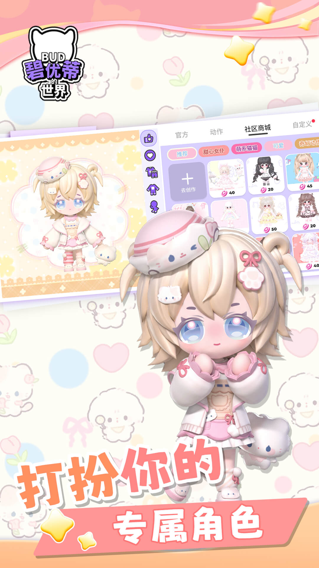 BUD国服,重磅回归! 欢迎来到BUD-碧优蒂的世界 ,释放你的3D创造力!跟着BUD一起进入奇幻3D世界,让想象力和创造力成为现实!BUD不仅仅是一款游戏,更是一个充满创意和探索乐趣的3D互动内容世界,让想象力引领你前行。加入这个拥有数百万玩家的社区,体验在广阔的 3D 世界中将你的想法变为现实的快感。 【打造专属服饰】 使用我们丰富的设计工具,开启你的时尚设计之旅。 多种服装模板随你挑选,自定义调色盘让你尽情发挥创意,打造属于自己的独特风格。从古典到现代,从日常到高定,你将有无限的创意空间,展现你的设计才华。快来挑战自己,打造属于你的时尚帝国! 【建造生动有趣的3D地图】 利用我们易上手的3D工具,创造你的梦想地图世界。 你可以选择各种基础模具和逻辑道具,打造独具匠心的地图,让玩家们畅游其中。无论是绚丽迷人的风景地图,还是趣味十足的闯关跑酷,超高的自由度让你可以尽情发挥想象力,创造出不同氛围的地图。快来释放创意,设计专属于你的独特地图! 【探索繁华热闹的互动社区】 深入我们内容丰富的社区,找到你的志同道合之友。