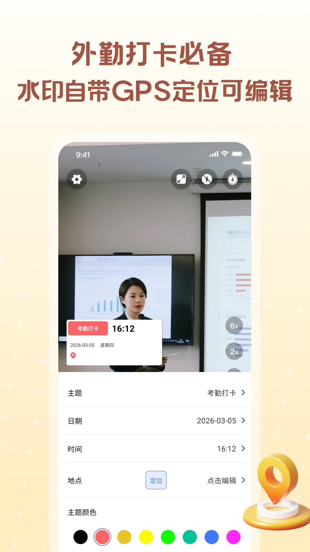 时间水印相机拍照,拍照留痕一步到位,工作生活全能记录~ 核心亮点 1、精准水印实时叠加,信息真实可溯源 2、丰富模板自由定制,工作生活双适配 3、高清拍摄 + 批量编辑,补录记录超省心 产品介绍 告别后期手动加印的繁琐,拒绝记录缺佐证的烦恼!这款时间水印相机专为全场景拍照留痕打造,是外勤办公、工程巡检、物业打卡、生活记录的必备神器,让每一张照片都有迹可循,每一次记录都高效便捷! 拍摄瞬间自动叠加精准时间、实时地点、经纬度、海拔等关键信息,水印数据真实,完美适配外勤考勤、执法取证、工程台账等专业工作场景,照片自带 “法律效力”,轻松满足工作留痕核验需求。 内置精美水印模板,考勤打卡、旅行记录、宝宝成长、节日纪念等场景全覆盖,支持自定义编辑水印。不止专业水印,更有全能拍摄编辑功能!办公效率直接翻倍。 一部手机,一个APP,搞定实时拍照记录需求!现在下载时间水印相机,开启高效、专业的拍照留痕新体验~