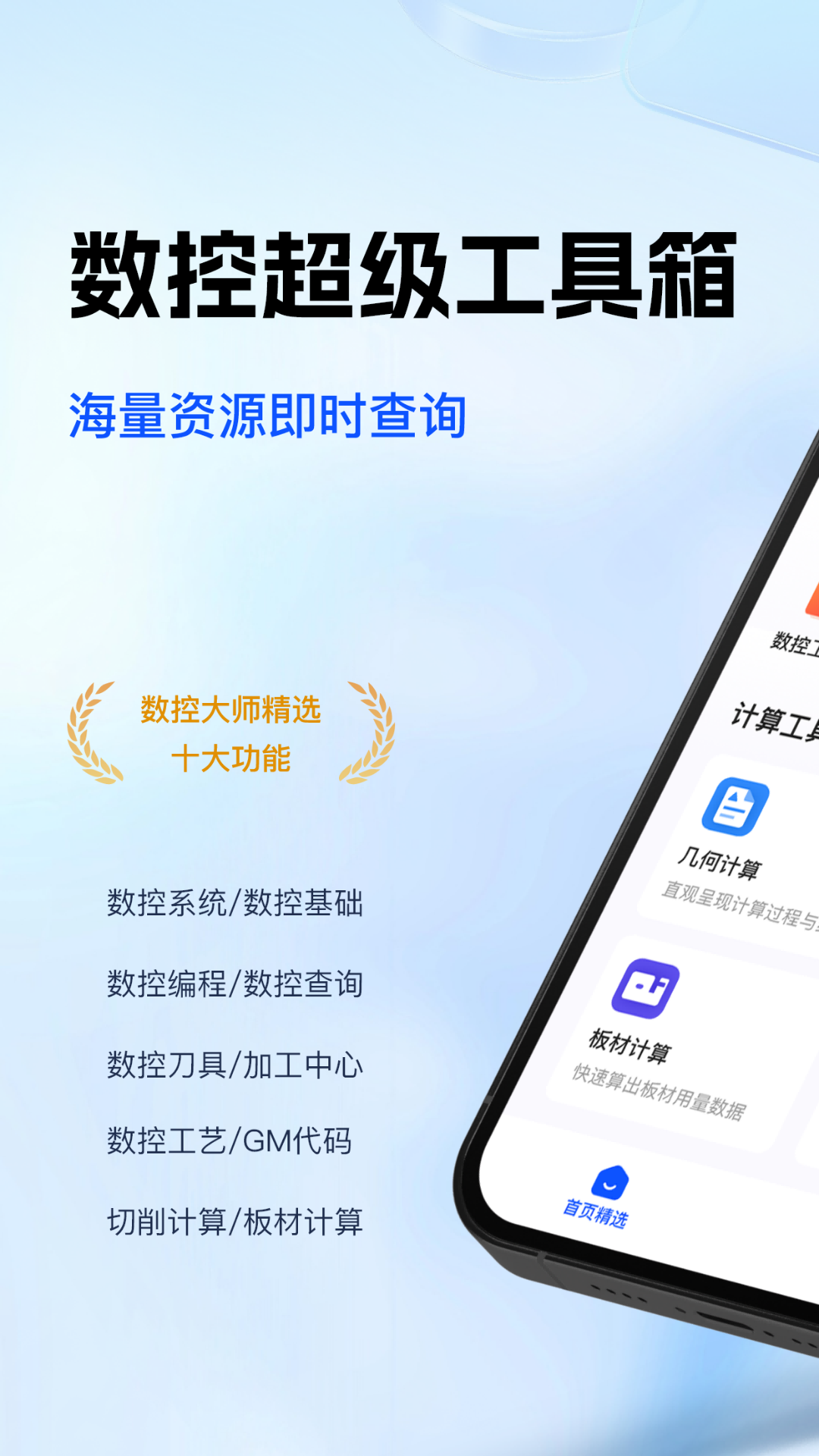 数控大师APP专为机械工程师、数控从业者及技术爱好者打造,集知识学习、编程实战、工程计算于一体,助力用户高效掌握数控技术精髓,轻松解决生产难题。 核心功能亮点 数控技术知识库 系统化梳理数控基础理论,涵盖数控原理、机床结构、加工工艺等模块,零基础用户也能快速入门。 编程实例宝典 提供经典编程案例,覆盖车削、铣削、线切割等主流工艺,支持按材料、精度、机床类型分类检索。 智能工程计算工具 1.几何计算:一键求解圆弧、锥度、螺纹等复杂几何参数,支持自定义公式输入。 2.切削计算:根据材料硬度、刀具类型自动推荐切削速度、进给量,优化加工效率。 3.板材计算:智能排料算法材料利用率,生成切割路径图与成本估算报告。