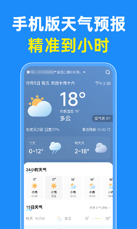 款致力于为用户提供精准、可靠天气信息的专业应用。 精准预报您身边的天气,方便您随时掌握当地天气情况! 【大字版天气预报】 专为中年家庭定制,字要大!图要大!就是要大! 【40日天气预测】 结合全球20多个数据源,精准预报40天天气预报,就是要长! 【分钟级降雨预测】 实时分析当前云图,知晓下雨何时雨停,就是要准! 【覆盖全国多个乡镇】 支持国内多个乡镇,全球20多万城市的天气预报,精准预报您身边的天气,检测覆盖,就是要广! 【万余个空气质量监测站】 万余个空气质量检测站,实时检测空气质量,展示空气情况。检测站点,就是要多!