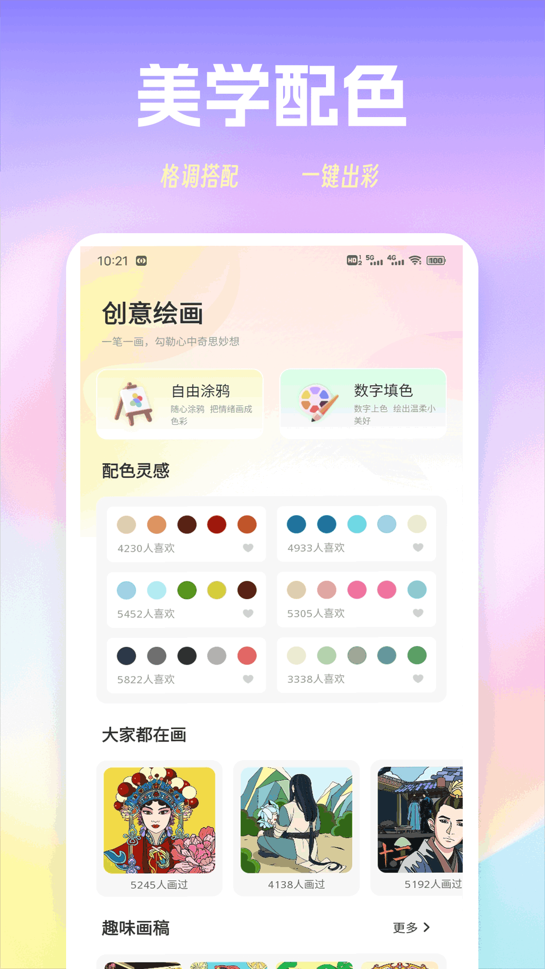 我们是一款创意绘画应用,集创作、娱乐于一体,内置创意绘画、配色灵感、趣味填色、定制壁纸、个性头像五大核心功能,让你随心挥洒灵感,轻松打造专属视觉作品。同时新增多款趣味互动玩法:你画我猜、你比我猜、成语猜猜、猜歌名,既能独自创作解压,也能与好友实时对战、欢乐比拼。操作简单易上手,色彩丰富不卡顿,无论是绘画爱好者还是休闲玩家,都能在创作与游戏中收获乐趣,随时随地开启艺术与欢乐双重体验。