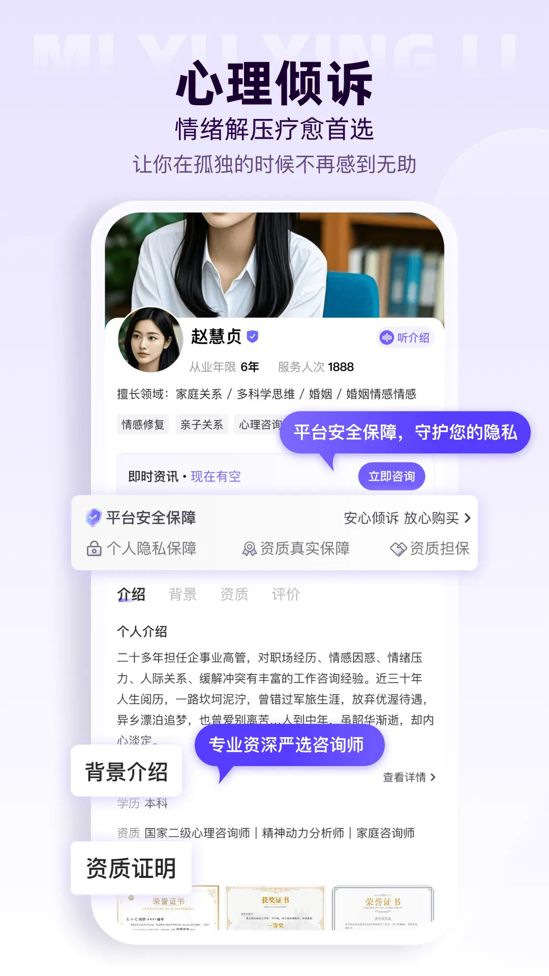 在纷繁复杂的世界里,每个人都需要一个倾诉的出口。 风铃倾诉,致力于为你打造一个安全、专业、温暖的线上心灵港湾。 风铃倾诉,守护你的每一份倾诉: 坚不可摧的隐私堡垒: 我们采用先进的加密技术,严格保障你的隐私安全,让你的每一次倾诉都安心无忧。 专业心理导师团队: 汇聚资深心理咨询师,提供一对一在线咨询,为你量身定制解决方案,陪伴你走出心理困境。 AI 心灵伙伴,懂你更懂你: AI 性格测试: 深入探索你的内心世界,帮助你更好地认识自己,发现潜在优势。 AI 倾诉陪伴: 24 小时在线倾听你的喜怒哀乐,提供温暖陪伴和情感支持,做你随时随地的心灵树洞。 风铃倾诉,不止于倾听,更致力于治愈。 无论你面临情绪困扰、压力焦虑,还是渴望个人成长,风铃倾诉都将与你携手,共同探寻心灵的答案,迎接更美好的自己。