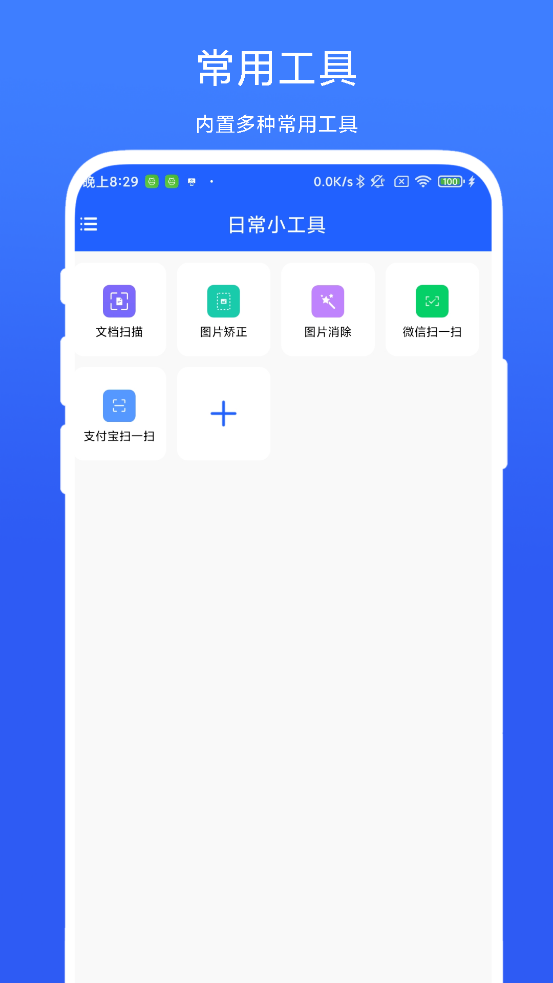 一款手机工具箱APP,软件内置多种实用工具,涵盖了日常工作生活中经常使用到的一些工具,比如:文档扫描、图片矫正、二维码扫描、打开网页、屏幕亮度设置等。另外,用户可以根据自己的使用习惯和频率将工具添加到APP首页,以便使用时可以快速找到并执行。